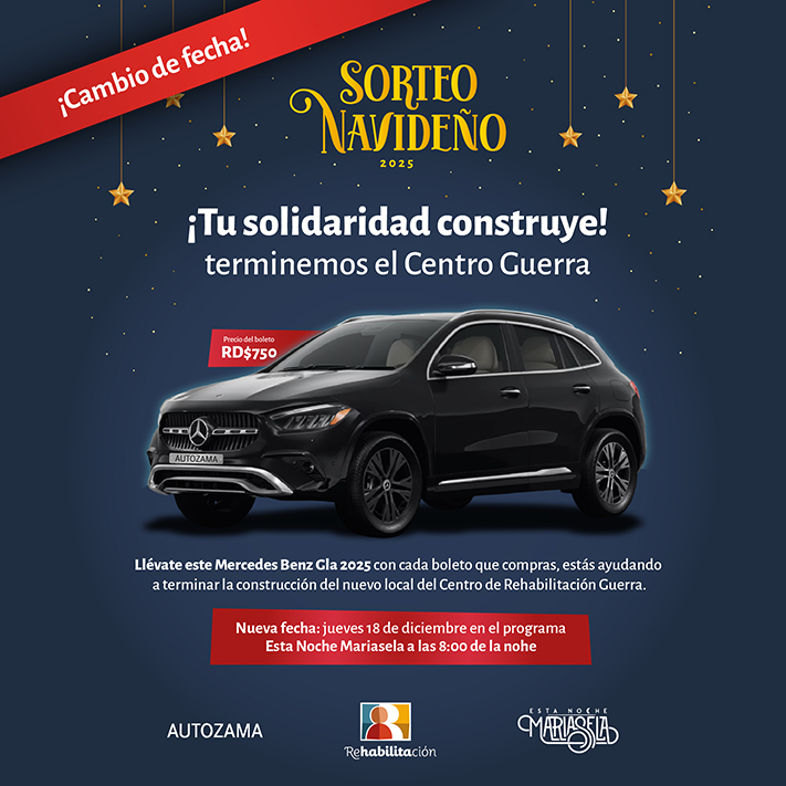Participa del gran Sorteo Navideño y podrías ganar una jeepeta Mercedes Benz GLA 2025, donada por Autozama y con cada boleto que compras, ayudas a terminar la construcción del nuevo local del centro de Rehabilitación guerra, un espacio abierto a la esperanza y nuevas oportunidades.